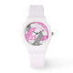 Die coole Volleyballuhr zeigt weiße Uhrengesichtsziffern und eine rosa, graue und weiße Volleyballgrafik, auf der man ihren Namen und ihre Trikotnummer anpassen kann - die rosa und graue Volleyballplatte wird mit einem gürtelhaften, kaleidoskopischen Muster vermischt - von katz_d_zynes