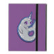 Ein niedlicher, hellgrauer Narwal mit weißen Flecken und Horngeruch, große hübsche lila Augen und ein fröhliches Lächeln mit seinem Schwanz, das auf einem hellen lila Hintergrund aufgerollt ist. Original Tinte zeichnend mit klaren grafischen Linien von Alicia Marie.