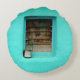GRAY STEEL CONTAINER ON WINDOW WITH TEAL PAINT RUNDES KISSEN