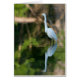 Ein großes Weißes Egret, stehend in einem flachen Fluss, der einen Fisch streift. Die Reflektion des Vogels ist in den noch ruhigen Gewässern zu sehen.