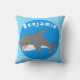 Ein glücklicher, hungriger großer weißer Hai schwimmt im Ozean. Gezeichnet im niedlichen Cartoon-Illustrationsstil auf blauem Hintergrund für einen lustigen Tag!