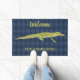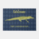 Erstellen Sie eine wilde Begrüßungsmatte, die perfekt für das Gator-Land ist. Dieses Doormat hat eine realistische Darstellung eines Alligators in einem Olivgrün Set vor einem marineblauen gemusterten Hintergrund und ist bereit, mit einem Namen in Übereinstimmung mit Olivgrün Schrift personalisiert zu werden. Sie können auch die Script-Überschrift oben anpassen.