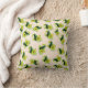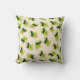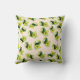 Ein Kissen mit einem grünen Avocado-Muster, das mit Aquarellfarbe erstellt wurde. Dieses Design hat einen perlenförmigen Avocado mit Stamm und Blätter intakt und der andere Avocado ist in der Hälfte geschnitten, um seine Grube freizusetzen. Sitzen auf einem Bett von Blätter. Set auf pfirsichfarbenem Hintergrund.