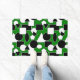 Diese Türmatte hat ein Bauhaus-Design aus Dreiecken, Kreisen, Rechtecken und Pentagonen in Schwarz-Weiß auf einem grünen Feld.