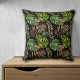 Dieses helle und farbenfrohe Kissen hat ein aquamarines und grünes Bild aus Palmenblättern und Kupferfarn-Bilder auf schwarzem Hintergrund. Ideal für Sonnen- oder auf Gartenmöbeln. Beide Seiten des Kissens haben das gleiche Bild.
