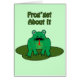 Ein grüner Cartoon-Frosch sitzt auf einem Lilienpolster, wobei seine Zunge herausklebt. Im Text oben steht "Frog'get About It"