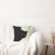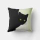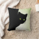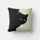 Eine schwarze Katze mit smaragdgrünen Augen schaut von hinten aus aus in einen grünen Raum.