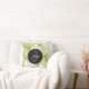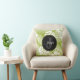 Ein Kissen mit einem sich wiederholenden Muster großer Palmen Blätter auf einem Olivenhain. Moderne und tropische Atmosphäre. Ein schwarzer Kreis mit einem goldenen Rand oben mit personalisiertem Namen und Monogramm innen.