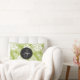 Ein Kissen aus Lendenwirbel mit einem sich wiederholenden Muster großer Palmen auf einem Olivenhain. Moderne und tropische Atmosphäre. Ein schwarzer Kreis mit einem goldenen Rand oben mit personalisiertem Namen und Monogramm innen.