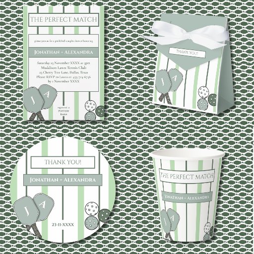 Celebrate love, laughter, and a perfect match with The Perfect Match Couples Bridal Shower favor gift box. This elegant, personalized and modern design features stylish pickleball paddles personalized with the couple’s monogram, paired with playful pickleball balls in soft tones of green and white. All elements are beautifully set against a chic mint, sage green and white stripes background, creating a look that is fresh, fun, and timeless. Perfect for couples who love a little friendly competition, this pickleball match–inspired favor is a charming way to say thank you to your guests. With modern typography font details and a joyful yet refined aesthetic, it’s ideal for a match made in heaven. Each favor gift box is thoughtfully finished with an elegant white bow, making it a standout keepsake your guests will adore long after the celebration.