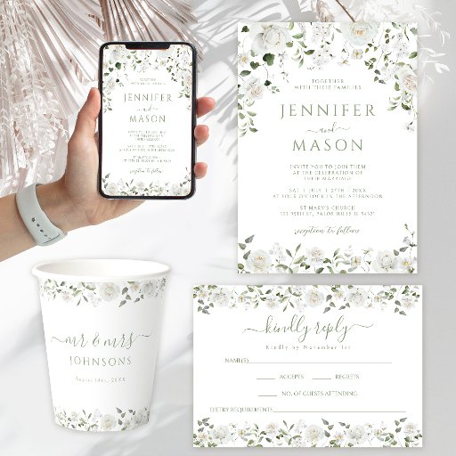 Green White Flowers Eucalyptus Rose Peony Wedding Einladung