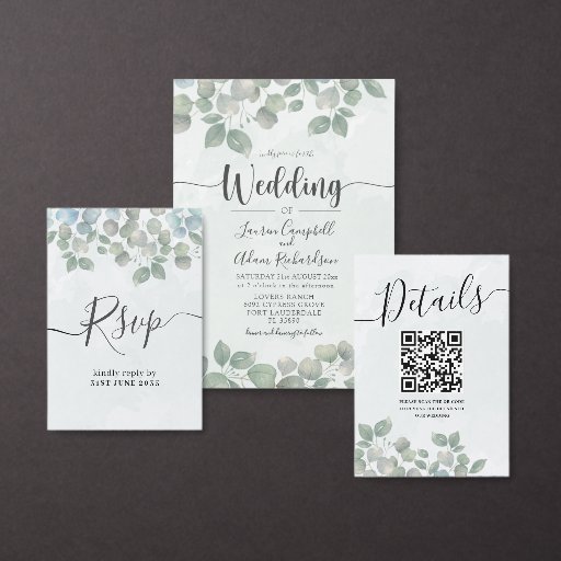 Eukalyptus sage grün Design macht die perfekte Hochzeitseinladung. Ein originelles Design mit sanftem Eukalyptus und koordinierender Vegetation in Aquarellfarben schafft einen atemberaubenden Hintergrund für Sie, um Ihre persönlichen Details hinzuzufügen. Sie müssen nur auf Personalisieren klicken und den Anweisungen folgen.