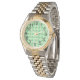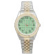 Diese Frauenuhr hat ein modernes Design von grünen vertikalen Linien mit Rechtecken darüber, wiederholt über das Design.