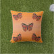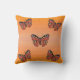 Dieses dekorative Kissen aus Outdoor-Stoff hat eine Gruppe von fünf hübschen goldbraunen orangefarbenen Monarchen-Schmetterlingen mit schwarzen Markierungen auf einem lebhaften orangen Hintergrund vorne und hinten.