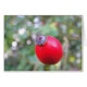 Eine einzelne, grosse, rote Hagebutte vor grünem Hintergrund mit weissen Punkten ist auf dieser Grusskarte. Die Karte ist blanko.
