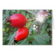 Zwei grosse, rote Hagebutten an einem Strauch mit grünen Blättern, durch den ein Sonnenstrahl scheint, sind auf dieser Grusskarte zu sehen. Die Karte ist blanko.