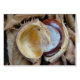 Eine Rosskastanie mit zwei Schalenhälften vor braunen, verwelkten Blättern und dunklem Hintergrund ist auf dieser Grusskarte zu sehen. Die Karte ist blanko.