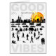 Skyline einer Stadt. Zwei Vogelherden und ein Hubschrauber über die Stadt. Zwei Reihen von bewegten Autos, Lastwagen, Bussen, Roller, Jeeps - viel Verkehr am Morgen. Eine Baumreihe trennt Verkehrswege und Fußgängerzonen. Die Leute gehen zu und von dem breiten Bürgersteig aus. Manche Leute haben es eilig, manche lügen Hunde. Kinder jagen sich gegenseitig, ein Straßenbusser spielt seine Gitarre, ein fauler Mann schmeckt das morgendliche Glas Wein oder vielleicht ist es gesünderer Drink. Ein küssendes Paar und eine Katze, die sich ausstreckt. Große orange und gelbe Sonne geht über die Stadt. Guten Morgen! Gute Vibes! Grußkarte für jeden Anlass. Anpassbar, können Sie zwei Zeilen Text ändern oder löschen GUT und VIBES. Sei glücklich!