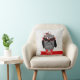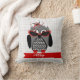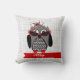 Ein Kissen, das eine Illustration einer grauen und schwarzen Eule mit einem Hahnentrittmusterbauch und roten Füßen kennzeichnet. Eule trägt einen roten und schwarzen fascinator Hut und rote eine Katzenaugen-Sonnenbrille. Personifizieren Sie mit Ihrem Namen. Gegenüberliegende Seite ist Hahnentrittmuster.
