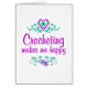 Crocheters genießt diesen schönen Entwurf, um ihre Gefühle auszudrücken. Weiche Blumen und ein Herz und die Wörter - das Häkeln macht mich glücklich. - sagt es allen.