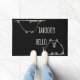 Hallo Auf Wiedersehen hat niedliche Gekritzelhundefußmatte, einen Gruß für Sie ob das kommende oder gehende your'e! Schwarzer Hintergrund mit Elfenbeingrafik.