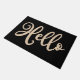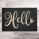Doormat mit dem Text "Hello" in einem eleganten Script-Schriftart. Neutraler hellbrauner Text auf schwarzem Hintergrund.