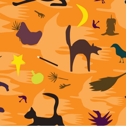 Spaß, buntes, Hexenmuster auf heller halloween orange, mit einer Hexe, einem Besen, einem Mond, einer seltsamen Fledermaus und natürlich mehr als einer Kätzin.