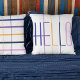 Moderne Marine, orange, lila, lila und weiße HELLO Typografie werfen Kissen mit bunten Streifen auf beiden Seiten.