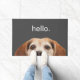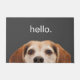 Herzlich willkommen auf Ihrer Zuhause mit einem niedlichen und lustigen Foto von JoDog, dem lächelnden Beagle, der Sie ausspioniert, und dem einfachen Wort "Hallo". auf dunkelgrauem Hintergrund. Gutes Geschenk für den Hund- oder Tierliebhaber oder als Hauswärmeschenk. Foto von JoDog und Design © von TK Goforth, alle Rechte vorbehalten.