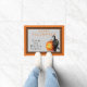 Halloween-Türmatte hat eine schwarze Katze neben einem Jack O'Lantern. Der Rand der Matte ist orange mit zwei schwarzen Rändern. Typografie sagt Happy Halloween und dann personalisieren Sie mit Ihrem Familiennamen.