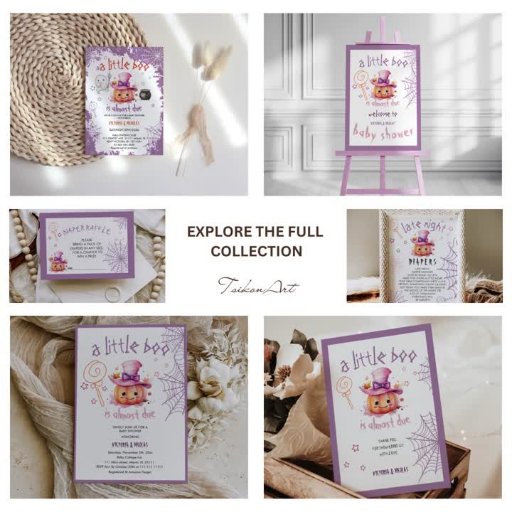 "Machen Sie sich bereit für eine spooktacular Feier! Unser 'Little Boo is Fast Due' Halloween Baby Girl Shower Einladung ist hier, mit bezaubernden Lila rosa Orangentönen und bezaubernden Freundinnen.