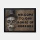 Halloween-Schädel mit einem schwarzen Hut, der eine Matte willkommen heißt. Typografie lautet "Willkommen in unserem Haus der Horror".