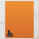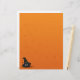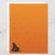 Happy Halloween Illustration mit einem Hexenhut mit goldenen Sternen und Mond und einer hängenden Spinne auf einem orangefarbenen Hintergrund mit Jack-o-Laternen Musterformen.