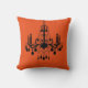 Ein trendiges Kissen mit einem unheimlichen schwarzen Kronleuchter auf orangefarbenem Hintergrund, das jedem Zimmer ein elegantes Halloween-Ambiente verleiht.