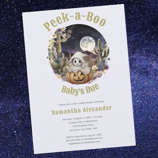 Begleiten Sie uns bei einer leckeren Babydusche, die die bevorstehende Ankunft feiert! Unsere Einladung "Flüchtige Blick a Boo Baby's Due" beinhaltet einen skurrilen Geist, der aus einem Kürbis hinausschießt, ein Set vor einer zauberhaften Wüstenlandschaft. Dieses Halloween-Event verspricht ein erschreckend lustiges Ereignis voller Liebe, Lachen und festlicher Geister zu sein. Kommen Sie in Ihr Lieblingshalbum und helfen Sie uns, das neueste kleine Gaul der Familie zu begrüßen! Klicken Sie auf Personalisieren, um Ihre persönlichen Daten hinzuzufügen. Sie können Namen, Farben, Größen und Schriftart-Stile ändern. Für eine erweiterte Anpassung klicken Sie auf Bearbeiten Design.