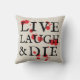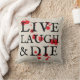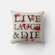 Eine Zunge in der Wange Version von "live, lachen, Liebe" zu Halloween werfen Kissen sagt "live, lachen & die" plus ein netter Spritzer Blut, um die zusätzliche Dosis von Horror zu Ihrer erhöhten, aber spoky, Wohngestaltung zu bringen.