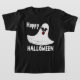 Weißer Geist mit roten Augen und Mund und schwarz. Schwarz-grauer Blitz durch Auge. Glückliches Halloween ist in coolem, weißem Schriftart geschrieben. Original Artwork Design von TamiraZDesign.