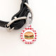 Desteis Beispiel eines Hamburgers, der einen Sesam-Samenbrunnen hat, der mit Käse, Salat, Rindfleisch, Tomaten, Ketschup und Beizen gefüllt ist. Auf der anderen Seite gibt es zwei personalisierbare Textbereiche, in denen einer für den Namen des Tieres ideal ist, während der andere für die Telefonnummer des Besitzers verwendet werden könnte.