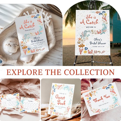 Add a sweet coastal accent to the favor table with this “She Is a Catch” pedestal sign, decorated with hand‑drawn seashells, fish, and beachy waves—ideal for nautical, seaside, and beach bridal showers.