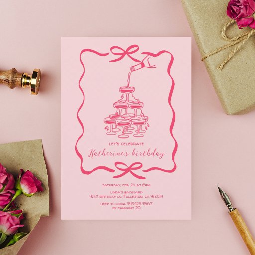 Hand Drawn Pink Champagne Tower Birthday Party Einladung