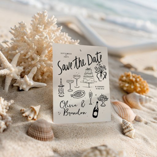This elegant yet playful design showcases delicate fun bright blue ink line illustrations — including cake, candles, wine, florals, and celebratory details — arranged in a soft, airy layout that feels personal, timeless, and joyful. Perfect for couples looking for a wedding invitation that is artistic, modern, and full of character without feeling overly formal.