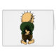 Die Zahl drehte seins zurück zu dem Zuschauer vom Jahr 1973 und umklammerte seine Hände hinter seinem zurück. Der Künstler erklärte, dass das zehnjährige alte sein Alter, als gezwungen, um Palästina zu verlassen, darstellte und nicht aufwachsen würde, bis er zu seinem heimat zurückkommen könnte; seins drehte sich zurück und umklammerte Hände symbolisierten die Ablehnung des Charakters "der Außenseitenlösungen". Handala trägt zackige Kleidung und ist barfüßig und symbolisiert seine Ergebenheit zu den Armen.
