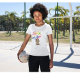 Happy und Free Dog T - Shirt: Kinderbekleidung, weißer T - Shirt, Cartoon Hund, positives ChaosDas Bild zeigt ein Kind aus dem Rücken mit einem weißen T - Shirt mit Grafik und Text darauf. In der Grafik steht ein Cartoon-Hund, der unten sitzt, und in dem Text oben steht "Happy and free" in bunten, stilisierten Buchstaben. Dieses Design eignet sich perfekt für die lässige Kleidung von Kindern und bietet einen fröhlichen und spielerischen Look, der positivity.age, lässige Kleidung, Grafiktee, bunten Text fördert.