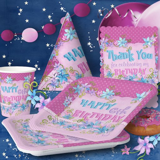 "Happy 6th Birthday" - wunderschöne Teller aus Geburtstagsparty mit rosa, blauen und violetten Aquarellfarben, grünen Wirbel und Pergament für Ihren Text, über lila und Baby-Rosa Hintergrund mit weißen Polka-Punkten. Niedlich, farbenfroh, mädchenhaft eingerichtet, ist die perfekte Dekoration für die Frühjahr/Sommer-Geburtstagsfeiern.