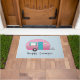 Pink RV Trailer Illustration mit "Happy Camper" Text auf hellblauem Hintergrund