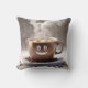 Lächelnde Kaffeetasse mit Lächelgesicht, Kaffeebohnen und weißem Dampf