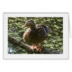 Eine glücklich aussehende Mallard-Henne sitzt auf einem Zweig, der am Roath Park Lake in Cardiff erbaut wurde.