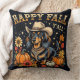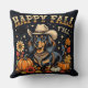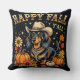 Eine kleine Cowboy-Dackel im Herbst Blätter und Kürbisse. Mit Happy Fall Y'all im Text.