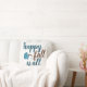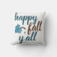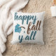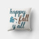 Niedlicher Fall werfen Kissen! Moderne Schriftzeichen zitieren in aquamarin und braun: "Happy Fall y'all" neben einem süß blauen fallenden Blatt. Einfach weißer Hintergrund. Gut für Herbst!