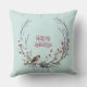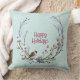 Ein wunderschöner Weihnachtskranz eines Wintervogels, der auf einem Ast mit roten Beeren und Schnee sitzt. Happy Holidays Text im Zentrum des Designs. Das Design ist auf beiden Seiten des Kopfkissens